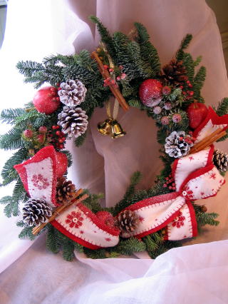 「今年のクリスマスリースは、リボンの存在感が大きく作用すると思ったので、 その存在を生かせるよう、工夫してみました。」 毎年ビューティフルボーイのレッスンで作るリースは、ひむろ杉とオレゴンモミを ベースにして、りんごや松ぼっくりで飾りつけをします。 土台からの手作りなので、生徒さんは毎年力仕事です。 でも、、この時期の季節行事になっているという方も多く、モミの香りを かぎながら、 「もう、今年もクリスマスの季節になりましたね。早いですね。」 などと、おしゃべりをしながら作業しています。 さて、今年のクリスマスリースですが、少しカントリー調なリボンで、 リースの原点に帰った感じ。 摂子さんの言う通り、フエルトのリボンの扱いが、今年のリースのポイントと なりましたが、彼女は色々工夫して、とても素敵なリースに仕上げてくれました。 リースだけではなく、いつものレッスンでも、 「今日は何か少し違った事を やってみよう。」 といった意欲にあふれるている摂子さん。 今年も素敵なクリスマスが訪れそうです。 |