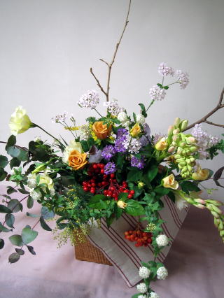 今回は早春の花を、バスケットを花器として投げ入れしています。 一番のポイントは、写真では見づらいのですが、枝物のサンシュと 朱色の実が美しいビバーナム・コンパクタの使い方。 サンシュは枝がかたいので、ためもききません。ゆえに、元々、 その枝が持っている曲線の美しさをいかに出せるかが決めてです。 そして、ビバーナム・コンパクタも実がとても重く、下に向いてしまうので、 その魅せ方が大事になります。 美帆子さんは、いずれの花材もじょうずにこなしています。 ビバーナム・コンパクタは、短かめにちょうど実が美しく見える位の長さとし、 低めのポイントとしています。又、色の濃いキャンディタフトを実の近くに 持ってくる事で、よりインパクトの有る、ポイントのはっきりした花となりました。 いつも明るくて、愛くるしい彼女らしい今回の作品。 一足早い春の訪れです。 |