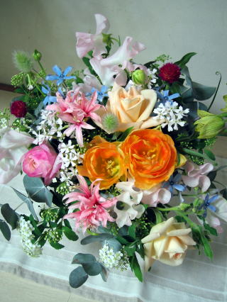 「ポイントになるチューリップ2本とバラ1本、この3本の配置を考えました。」 典子さんがおっしゃるように、アレンジ全体の大きさ、構成等をイメージしたら、 まず、ポイントとなる花をどのように魅せていくかを、 考える事が重要になります。 花を立体的に美しく魅せるには、花の色や形のみならず、 花と花との高低差のつけ方などで、どう構成するかが大きなポイント。 写真では少しわかりづらいですが、開きかけのチューリップともう1本の チューリップ、そしてバラ(サハラ)の3本の高低差を少しつけることで、 アレンジのフォーカルポイントとなる部分を立体的に表現しています。 与えられた花材の中で、どの花をメインに、そしてどの花を脇役に 使うかをはっきりさせる事はとても大切。 綺麗な花を見ていると、どれも主役にと思いがちですが、 そのポイントをきちんとふまえた今回の作品は、 典子さんのような、しっかりとした構成のアレンジメントになりました。 |