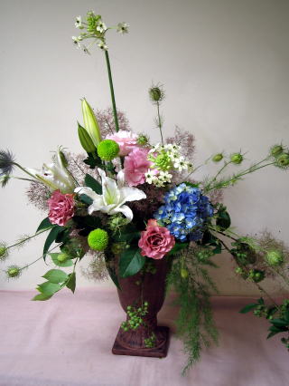 | 第8回目の作品はせい子さんの作品。 彼女はビューティフルボーイでレッスンを始めて今年7年目。 今回は、高さ40cm、口径約25cm位の大きさのアンティークな 雰囲気がある陶器に花瓶活けしました。 |