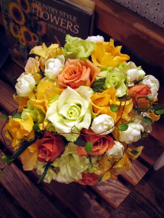 「左手で支点を固定しながら、右手で花を足していくのは、思ったより大変。 花の位置がずれてしまったりしたので−。 ブーケの中心に、一番綺麗なバラをもってきて、目立たせるようしました。 それから、色合わせにも注意しました。」とおっしゃる恭子さん。 今回、初めてクラッチブーケを作った恭子さん。 花瓶活けやアレンジメントとは、又、違った難かしさがあったようです。 レッスンのクラッチブーケは、数種類のバラのみでブーケを作りました。 色々なタイプのクラッチブーケがあると思いますが、今回のブーケはバラの形と 色合い、そして、自然な茎の曲がり等を生かして構成すると、美しく仕上がります。 最初に一番綺麗なバラを中心と決めて、その中心がずれないよう、他のバラを 足していき、本当に美しいラウンド型のブーケが出来ました。 昨年の恭子さんのウエディングが思い出されるようなブーケの仕上がりでした。 |
