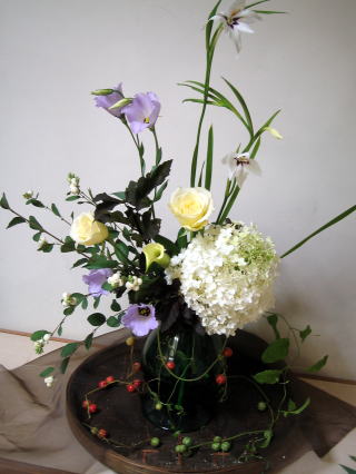 今回は秋らしくなった花材を使っての花瓶活けのレッスンでした。 この季節に出回るシンフォリカルポスの細くて美しいライン、 ミナヅキのたわわについた花房、そして線の綺麗なアシダンセラの 生かし方がポイントです。 ミナヅキは本当に綺麗な花ですが、ボリュームがかなりある為、他の花との バランスを取るのは難しい花材です。梨津子さんは、花器の口元近くに、 このミナヅキを角度を、少しななめに、そして、又、縦にすっと伸びた アシダンセラをもってくることによって、目線を上にもっていき、 ミナヅキの見た目のボリューム感を少なくし、他の花とのバランスを 取っています。 シンフォリカルポスも実のかわいらしい枝ですが、大きめの葉を少し間引く ことによって、枝本来の美しさも出しています。 身体は小さいのですが、いつも大きく、大胆に活ける梨津子さん。 これからもその個性を大切にのびのびお花を活けて下さることを 楽しみにしています。 |