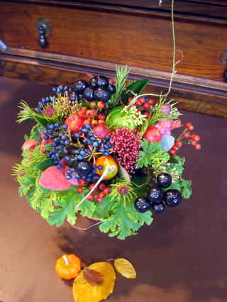 | 第22回目の作品は久美子さんの作品。 彼女はビューティフルボーイでレッスンを始めて、今年4年目。 今回は秋の実ものづくしアレンジです。 |