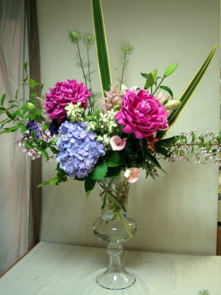 | 6月になると花屋の店頭に並ぶ花は、夏らしい大型の花が多くなってきます。 その中でも代表的なあじさい、百合(ルレープ)、しゃくやくなどを使用した 花瓶活けです。 そして、美規子さんが、今回使用した花器は、ガラスの高さのある器です。 ナツハゼ、姫ウツギなど枝物で、全体の花の骨格を作り、あじさい、 しゃくやくなど、ポイントとなる大型の美しい花を入れています。 これらの花は大きさも同じ位のものが多いので、それぞれの長さ、 花の角度などによって変化をつけていきます。 美規子さんはその点も踏まえ、うまく小花や葉ものを使っています。 本当に花は不思議とその人自身が作品に表れてきます。 今回のお花は美規子さん同様芯のしっかりとした、そして、 少しクールな(甘すぎない)とても素敵な花となりました。 |