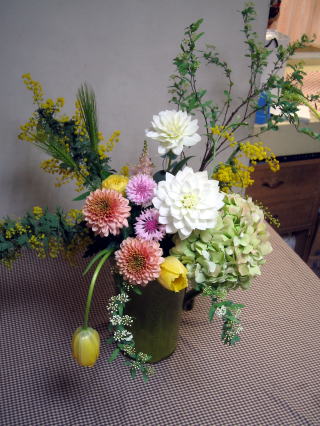 | 「お花の長さを調整してオウトツを出し、中心に目線がいくようにしました。 そして、ダリアの花が一番綺麗に見えるよう活けてみました。」 とおっしゃる律子さん。 春を告げるこでまり、ミモザの枝ものに、チューリップ、ダリアなど 優しい色合いの花材での花瓶活けです。 花の形、大きさが似たような花材で、変化をつけていく事は難しいことです。 律子さんがおっしゃるように、長さを調整して立体感を出さないと、 奥行きのない平面的な花になってしまいます。 その点、律子さんは花の特色を生かして、わずかな長さ、角度の違いを 花にほどこしています。ダリア、そして他の花々が美しく見えるのは その為です。 「美しく花を活ける。」 これはいけ手にとっての命題ですが、美しく活けるさまは 人それぞれです。 レッスンでわずかな手直しをすれば、自分の作品が素敵になる事実、 そして失敗を恐れることなく、挑戦しつづけて下さればと願っています。 いつも一生懸命くふうしながらお花と向き合っている律子さん。 今後益々の飛躍を期待しています。 |